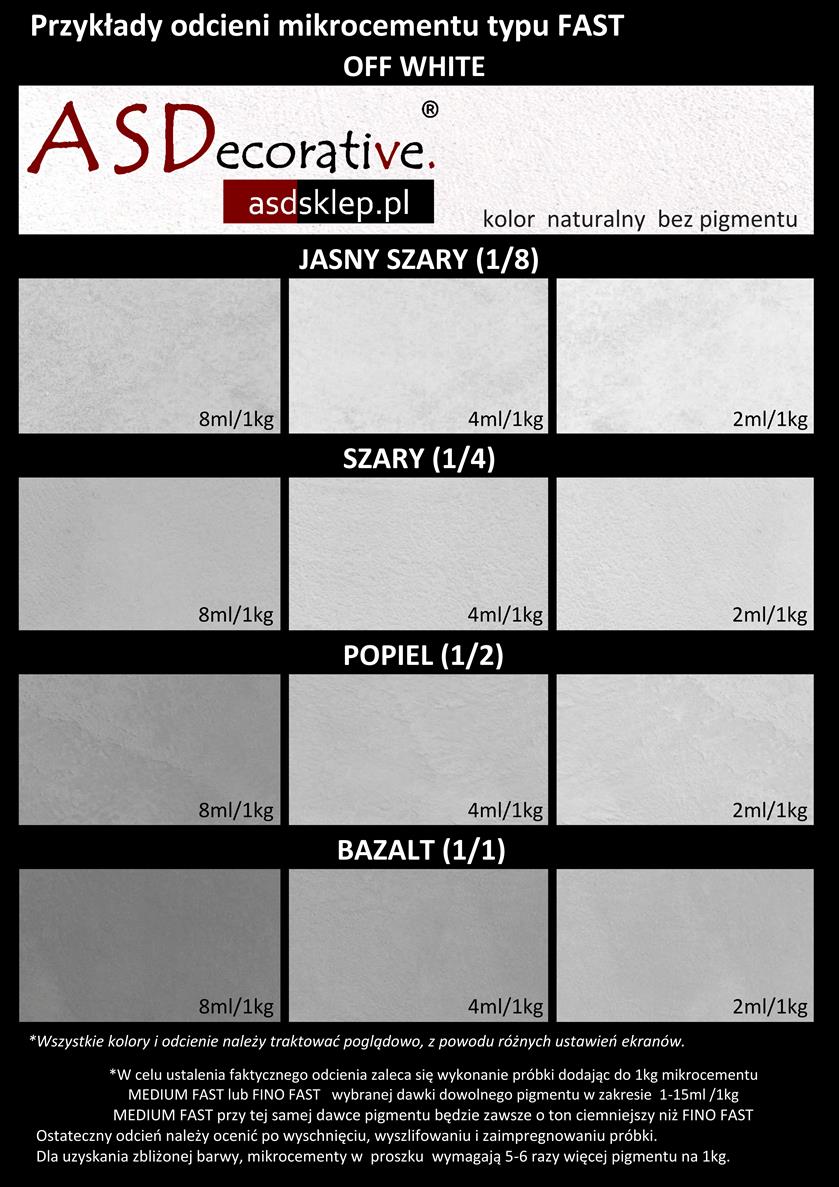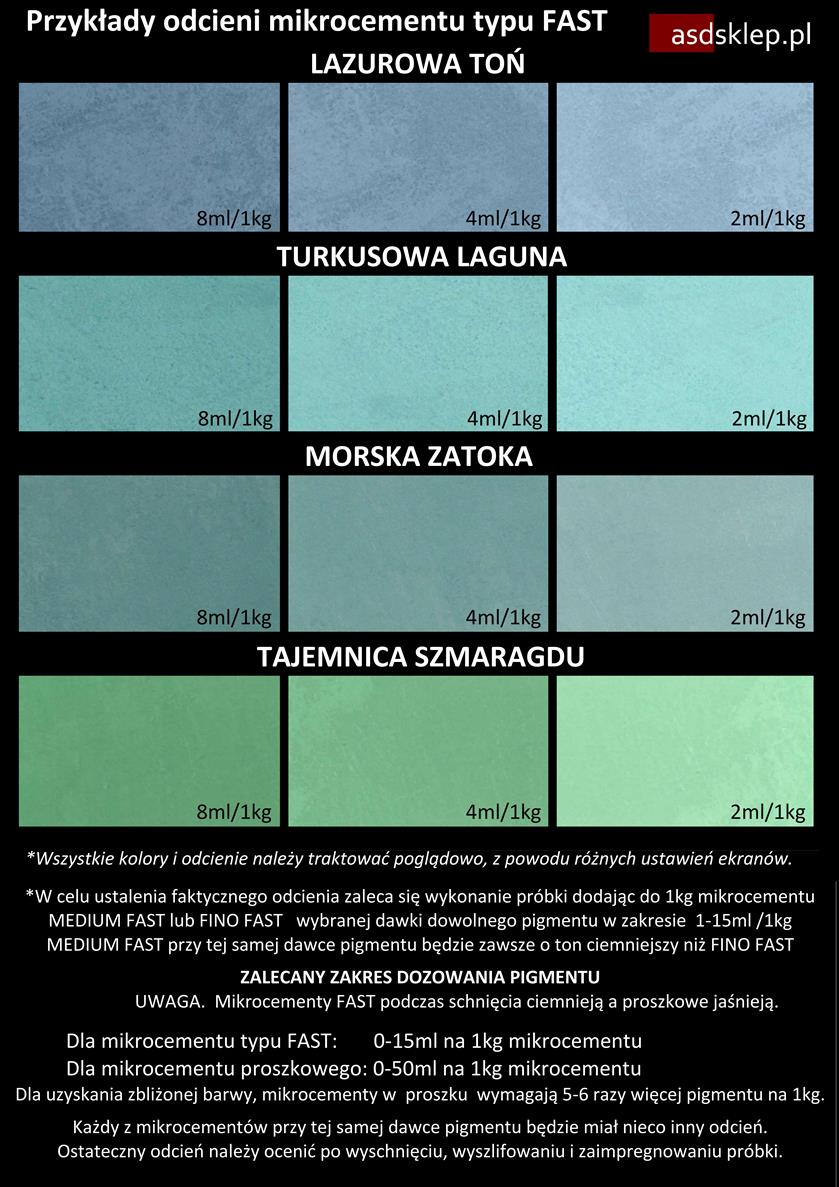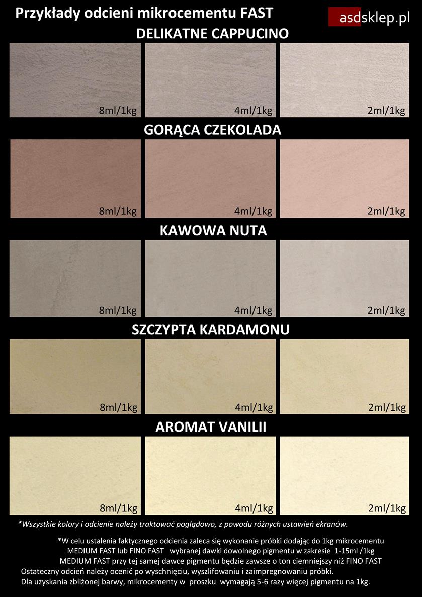 * Odcień każdego koloru można dowolnie rozjaśniać zmniejszając ilość dozowanego pigmentu, lub przyciemnić, nie przekraczając dawki: 15ml/1kg dla mikrocementów FAST oraz 50ml/1kg dla mikrocementów proszkowych.
