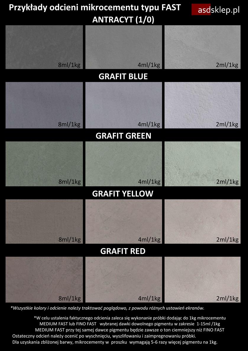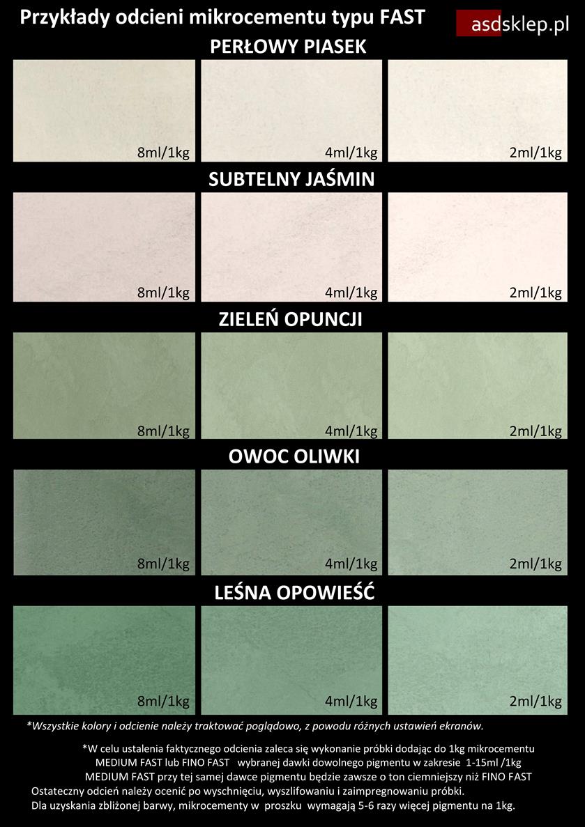 *W celu ustalenia faktycznego odcienia zaleca się wykonanie próbki dodając wybraną ilość dowolnego pigmentu do 1kg mikrocementu MEDIUM FAST lub FINO FAST